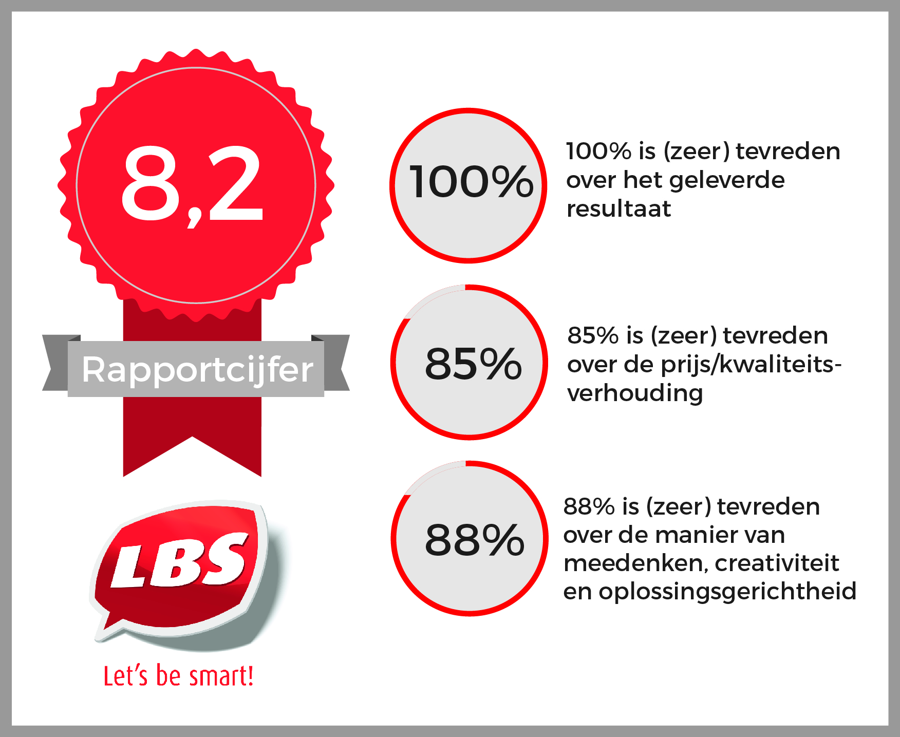 Wij willen dat je tevreden bent over onze service en producten. Medio 2017 deden we onderzoek naar de ervaringen van onze klanten met LBS. Wij ontvingen als gemiddeld rapportcijfer een 8,2.