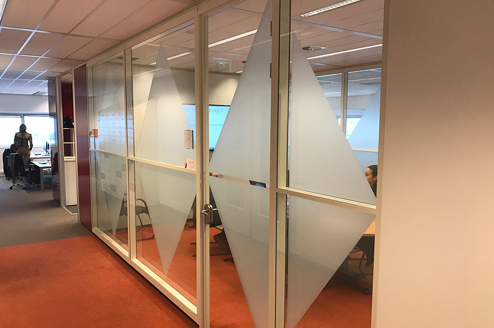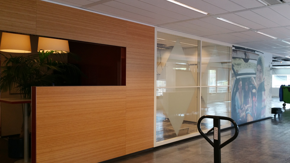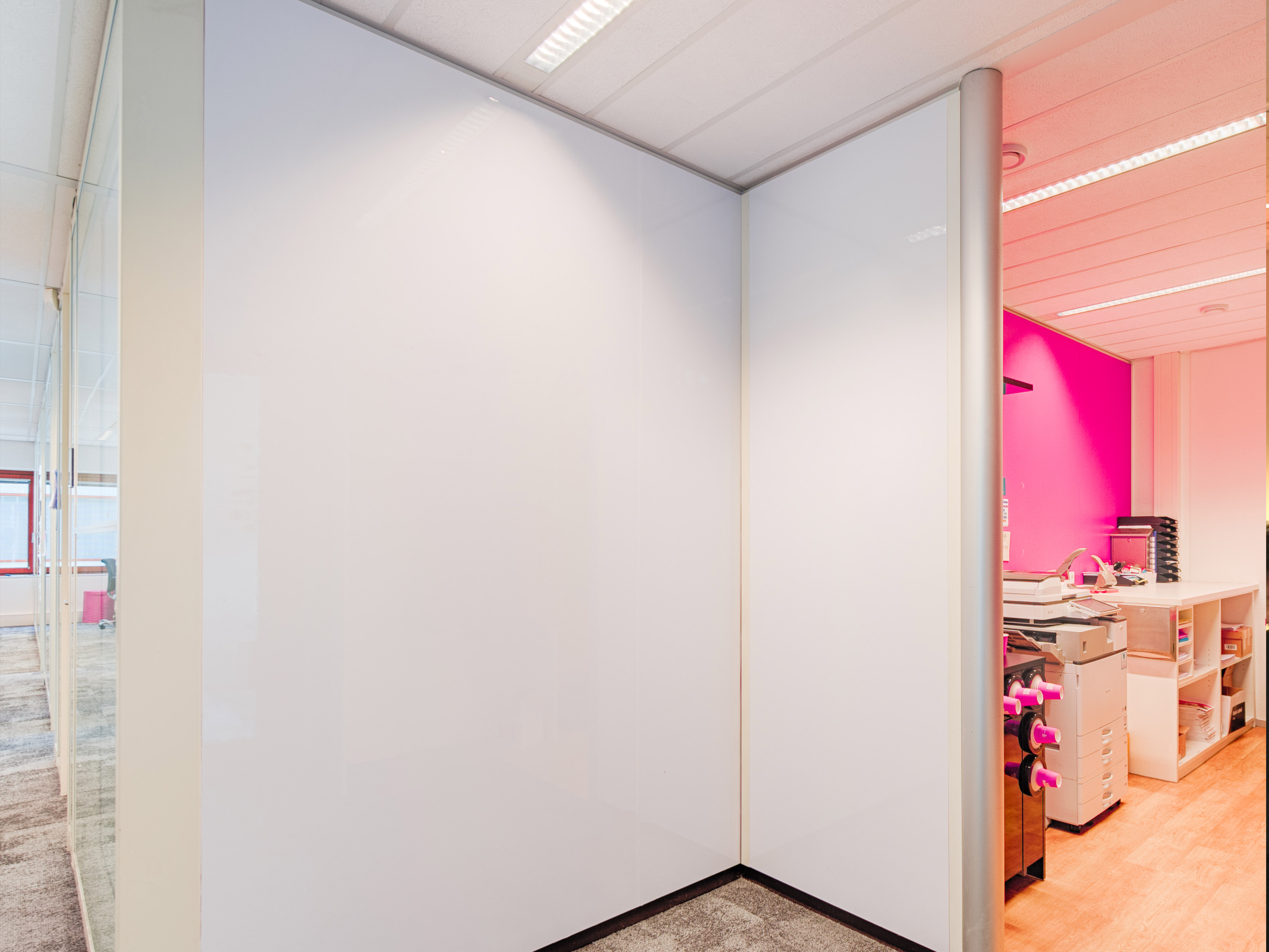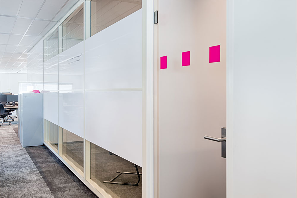Honderden meters wandvullende whiteboardfolies op de wanden, privacyfolies bij de vergaderruimten en verdiepingen vol met de huisstijlkleur magenta (roze) op ramen, deuren en systeemwanden. Kortom, grenzeloze creatieve ruimte in het interieur, waar we je graag meer van laten zien.